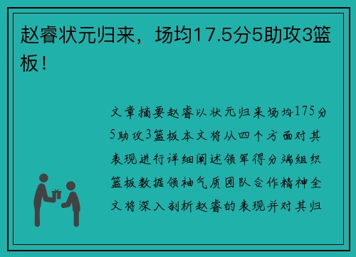 赵继伟蝉联CBA总决赛MVP,创造历史纪录!文章摘要的内容赵继伟再次蝉联CBA总决赛MVP,这一成就创造了历史纪录,为他个人职业生涯增添了辉煌的篇章。本文将从赵继伟的比赛表现、领导能力、对球队的影响以及个人成长等四个方面对他蝉联MVP的历史性意义进行详细阐述。1、比赛表现赵继伟在总决赛中的出色表现,...